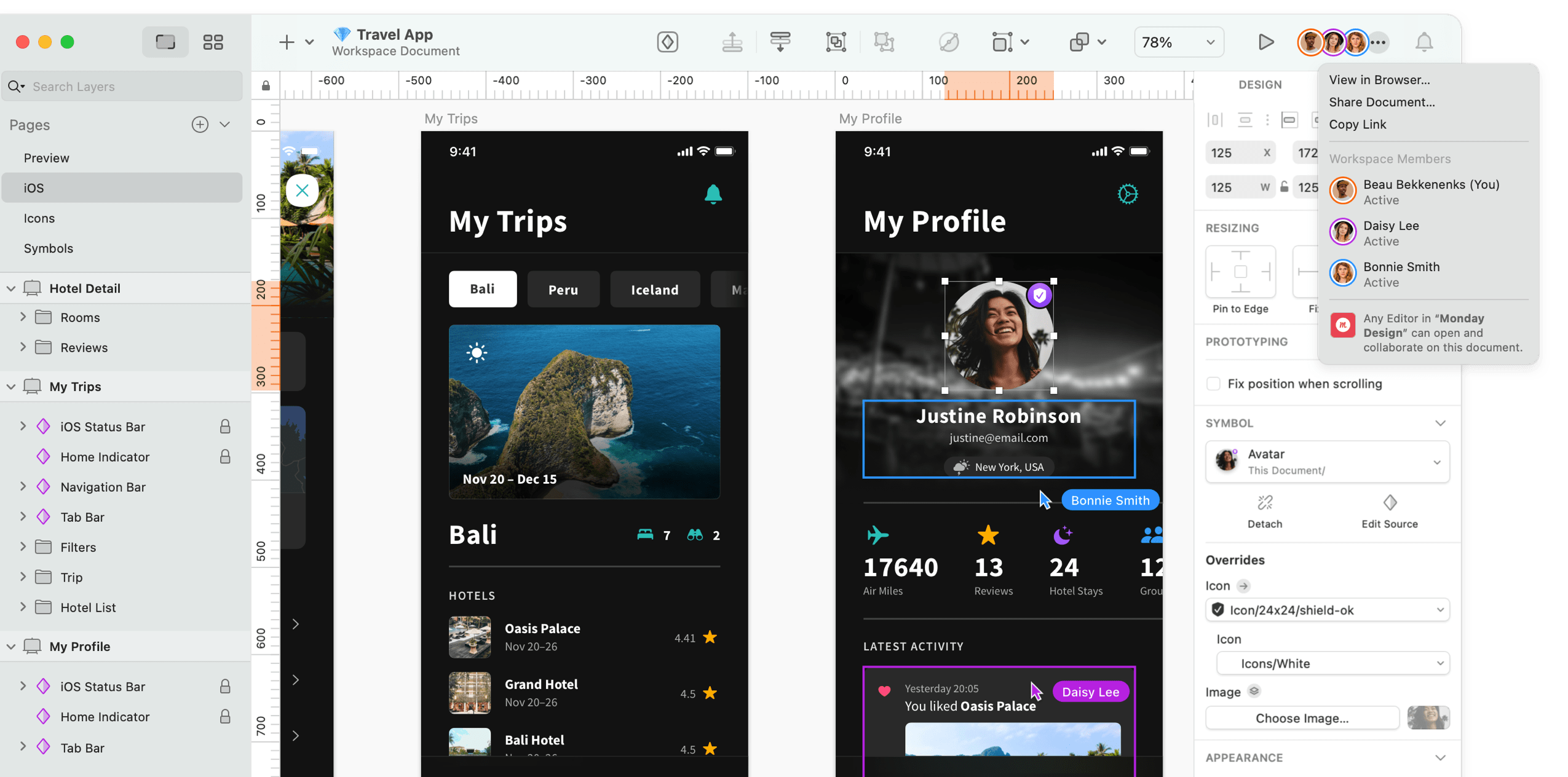• Design together in real-time, see each other’s cursors while you work, and use our Follow feature to give presentations — all in our powerful native editor.