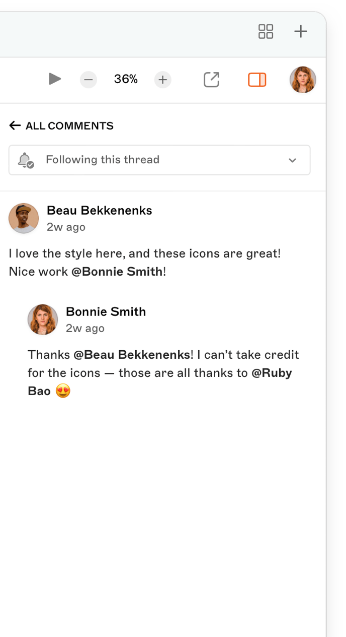 • Get detailed feedback with Artboard-level comments, @-mentions and threading, and stay up to date with customizable notifications.