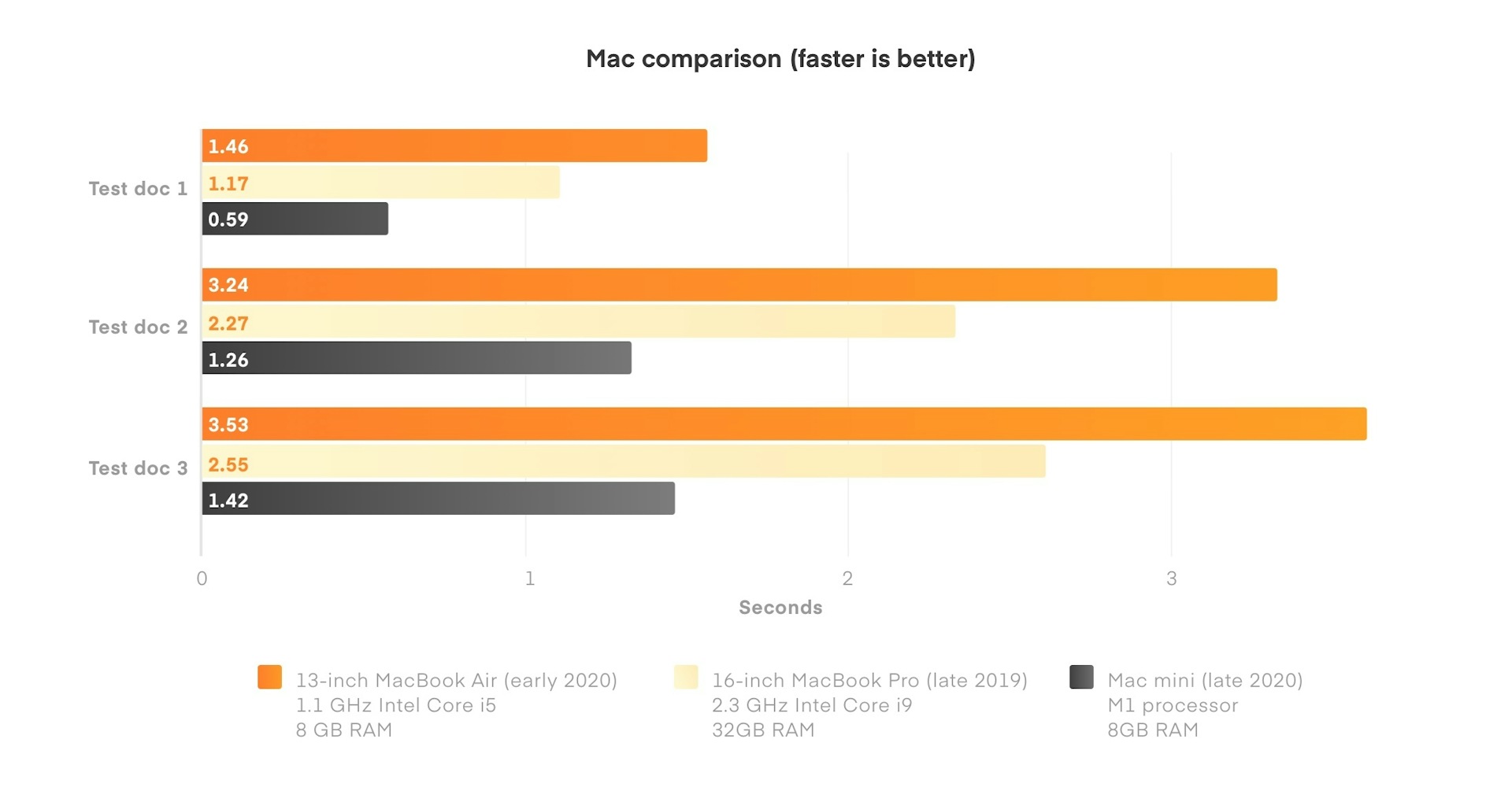 Again, the results are staggering. The 2019 MacBook Pro, as could be expected, easily outpaces the MacBook Air. But then our new Mac mini goes a step further, blowing both of them out of the water. The new Mac mini consistently completed these tasks three times faster than the early 2020 MacBook Air, and twice as fast as the 2019 MacBook Pro.