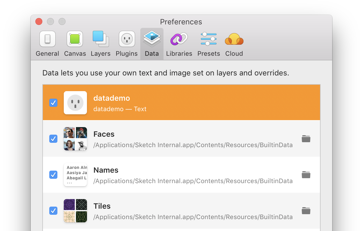 Sketch supports two types of Data for layers: images and plain text. A single plugin can provide multiple data types, so if you need to provide text and images at the same time, you can do so with just one plugin. When a layer is selected in the app, or an override’s Data icon is clicked in the Inspector, Sketch enables the relevant sources for each layer type. We’ll learn how to register a plugin for each Data type later on.