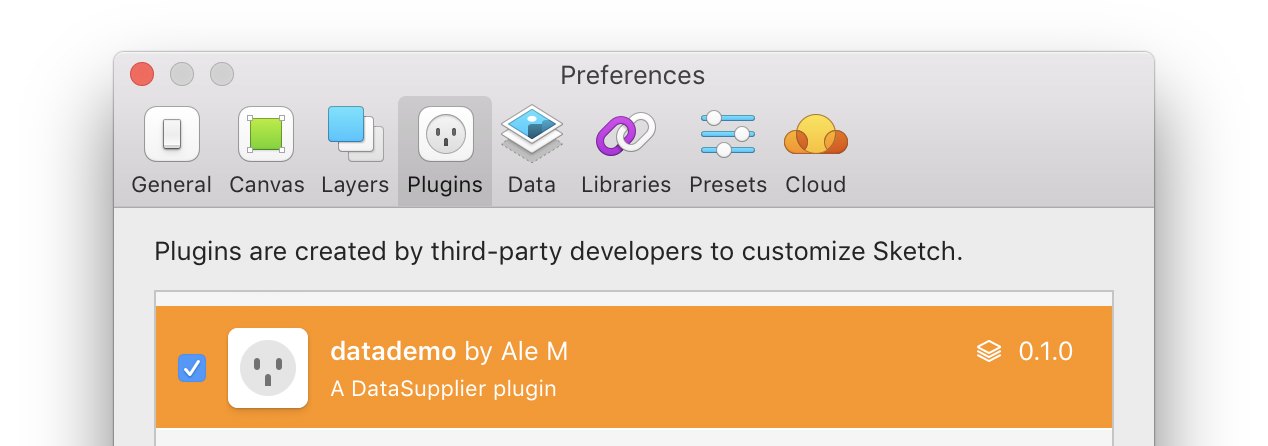 That will build our Data plugin, and make it available in Sketch. You can see your plugin in the Plugins section in Preferences: