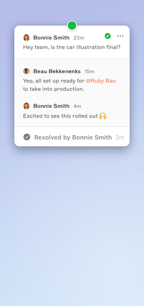 Pin comments on designs, reply in threads, then resolve them when you’re done.
