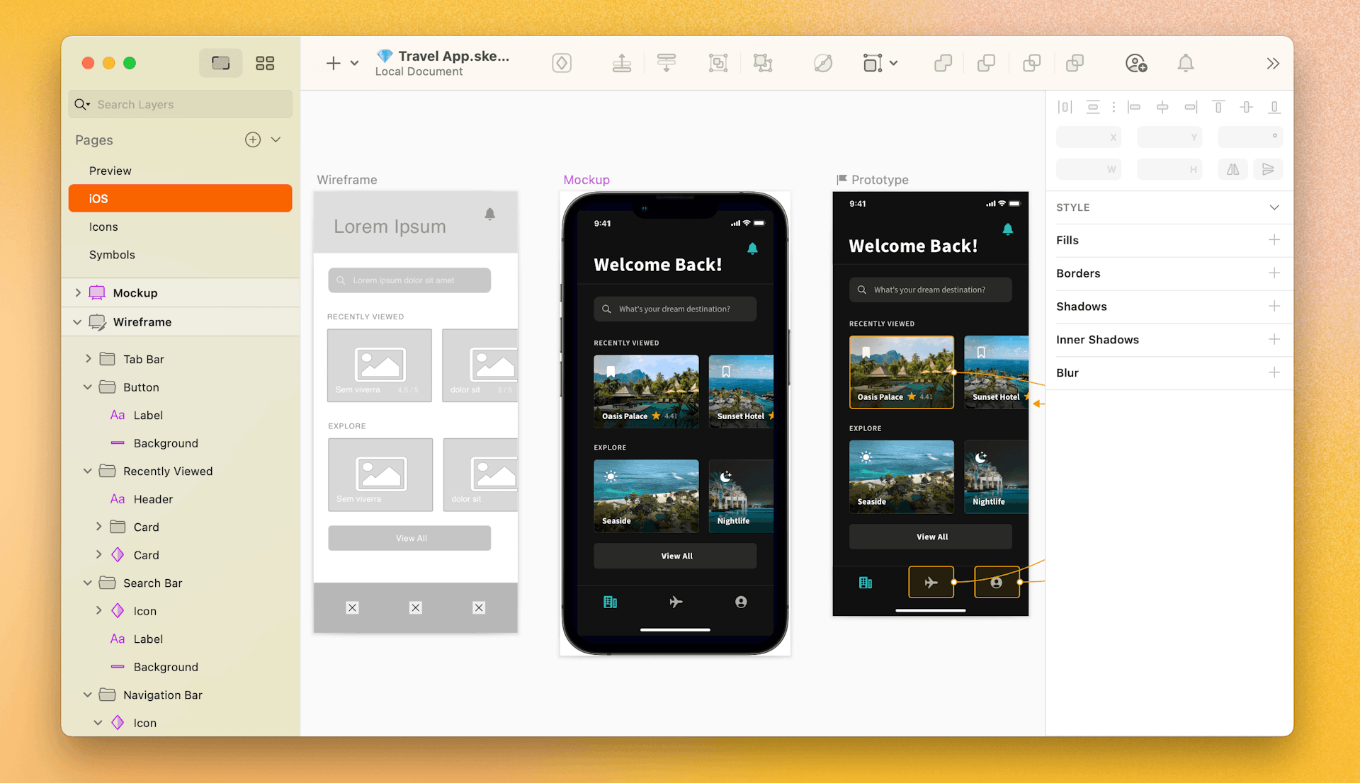 We can see the similarities and differences between a wireframe (left), mockup (middle) and prototype (right) in this example of a travel app.
